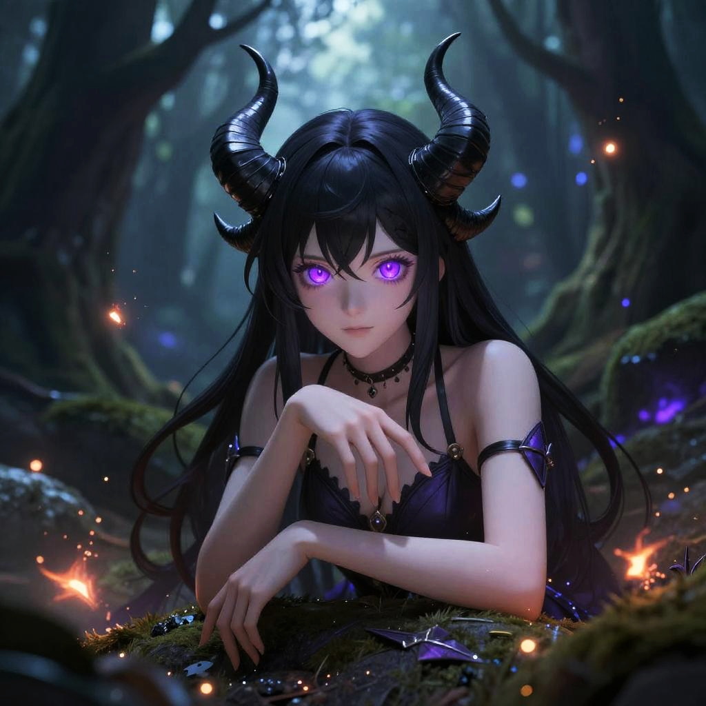 Beautiful sexy demon character in anime style, with sharp black horns and vibrant violet eyes, languid pose in enchanted forest with ethereal glows and floating embers, detailed realistic textures and mystical dark fantasy atmosphere.