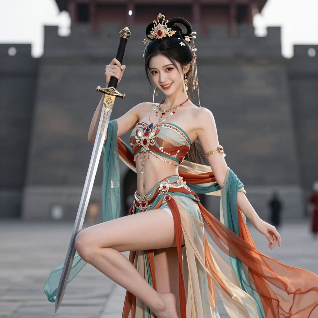 CR1.3, (flirtatious, seductive:1.4), (RAW photo:1.2), (photorealistic:1.6), (lens 135mm, f1.8:1.2), (ultimate quality, masterpiece:1.3), (intricate details:1.2), (detailed face:1.2), dramatic, ray tracing, fashion photograph, good hands, Fixhand, fFaceDetail, Full body, Sharp focus, cinematic lighting, (floating clothes, thighs, dunhuang cloths, hanfu, waist cape, strapless, navel, robe:1.2), Unlimited Blade Works, holding weapon, ├е┬Й┬С, ├д┬╕┬н├е┬Ы┬╜├е┬Е┬╡├е┬Щ┬и, hesizairenjian, xingzijue, shandian, (holding sword, sword, fighting stance:1.6), (1girl, solo, outdoors, war castle:1.6), confident smile, beautful face, (large breasts, narrow waist:1.2), sexy body, perfect body, shiny hairs, zanhua, hair ornament, earrings, necklace, jewelry, (anatomically correct hands, anatomically correct feet, anatomically correct body:1.6)