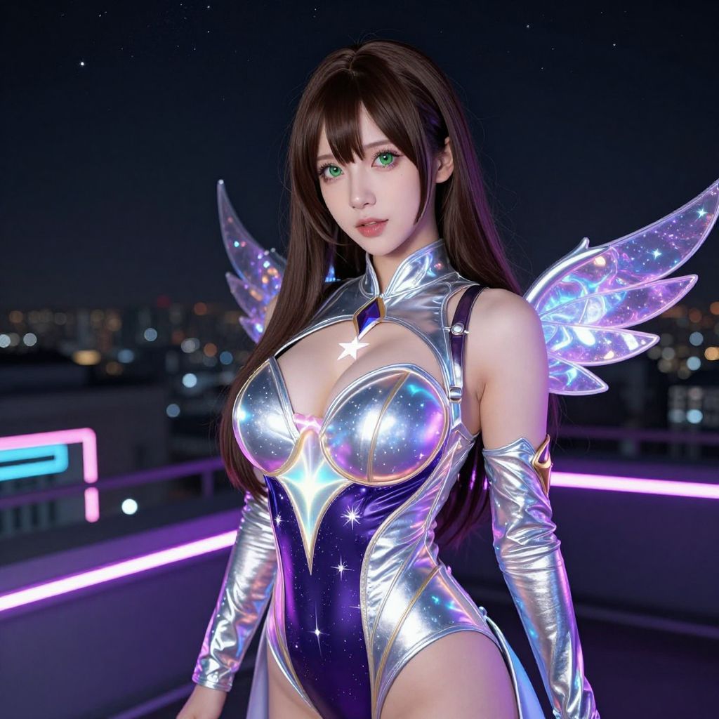 This is a digitally-created, hyper-realistic CGI image of an anime-style woman with long, dark brown hair and green eyes. She wears a shiny, silver and purple, high-cut leotard that accentuates her large breasts, with matching silver arm sleeves. Her outfit is adorned with transparent, wing-like extensions that glow in multiple colors. She stands on a rooftop at night, with a cityscape blurred in the background, featuring neon pink and blue lights. Her expression is neutral, and the overall aesthetic is futuristic and magical.