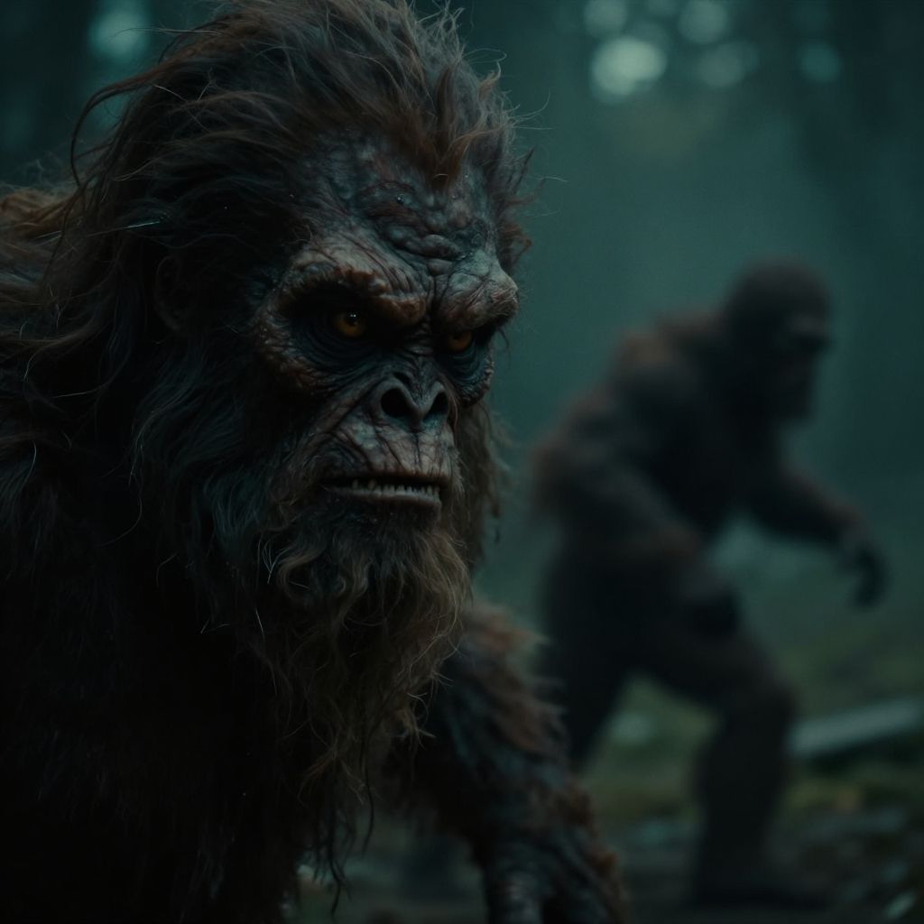 Cinematic film still extreme close up, cinematic photo cinematic film still cinematic photo a mysterious bigfoot is running from right side to the left, in the backgound of 50m, nearly hidden for the camera:1.8), extreme detailed face, demonic eyes, highly detailed ancient clothing, cinematic, dark, horror, spooky, detailed depth, . 35mm photograph, film, bokeh, professional, 4k, highly detailed . shallow depth of field, vignette, highly detailed, high budget, cinemascope, moody, epic, gorgeous, film grain, grainy
