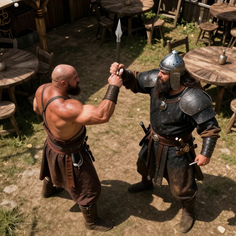 A photograph of two muscular, bearded men engaged in a medieval duel. The man on the left, bald and shirtless, wears brown leather pants and arm bracers, holding a pointed sword to the chin of the man on the right, who is armored in silver shoulder plates, a black tunic, and a metal helmet. They stand on a grassy, dirt path surrounded by wooden tables and chairs, with sunlight casting shadows. The image has a slightly exaggerated, almost cartoon-like style, with vivid colors and sharp contrasts.