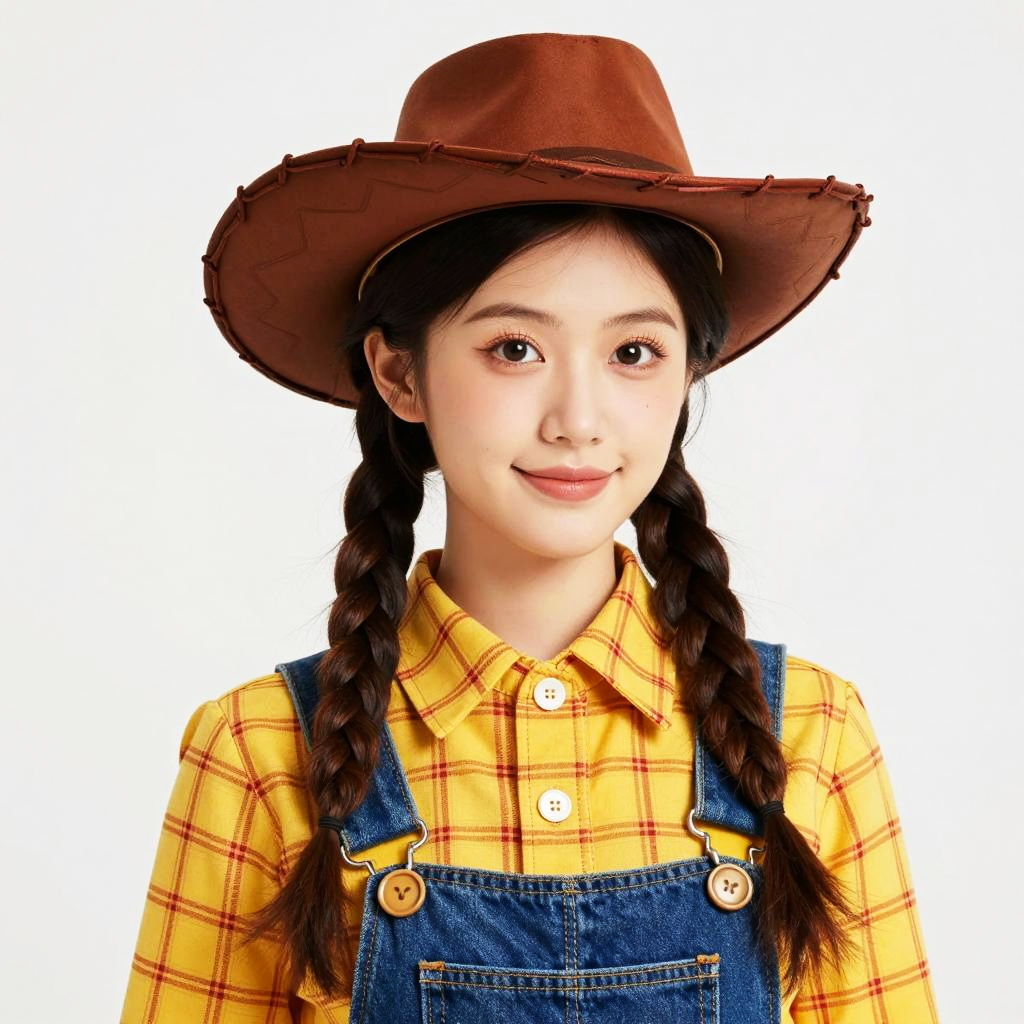 A woman dressed in a Woody costume from Toy Story, featuring a brown cowboy hat, yellow plaid shirt, and denim overalls with a prominent 'Y' button. Her hair is styled in two braids, capturing the essence of the classic cosplay character in a bright, well-lit portrait.
