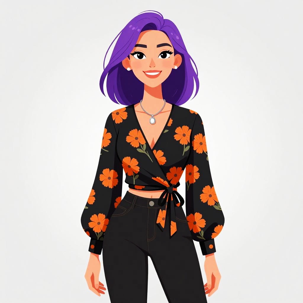 Digital illustration of a smiling woman with purple hair, wearing a black floral dress, holding a red handbag, standing in a brightly lit, minimalist room