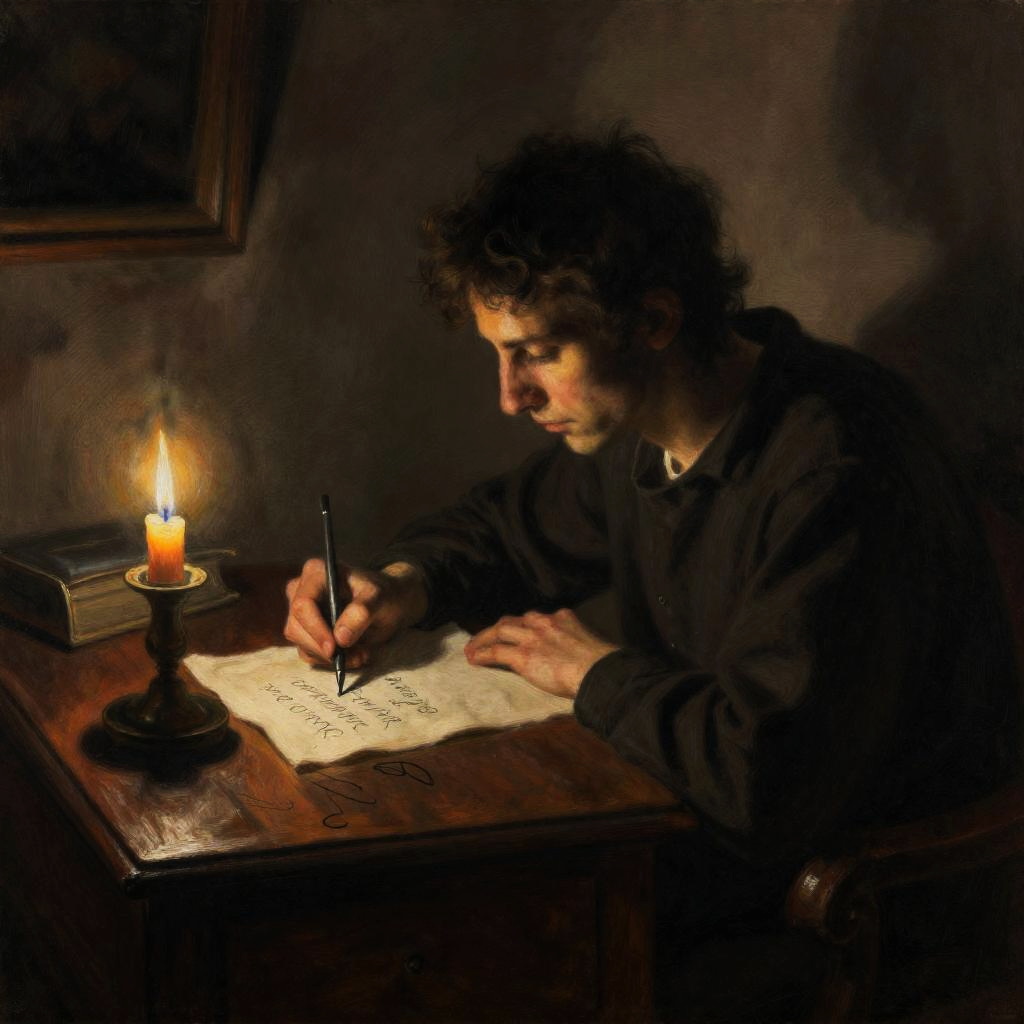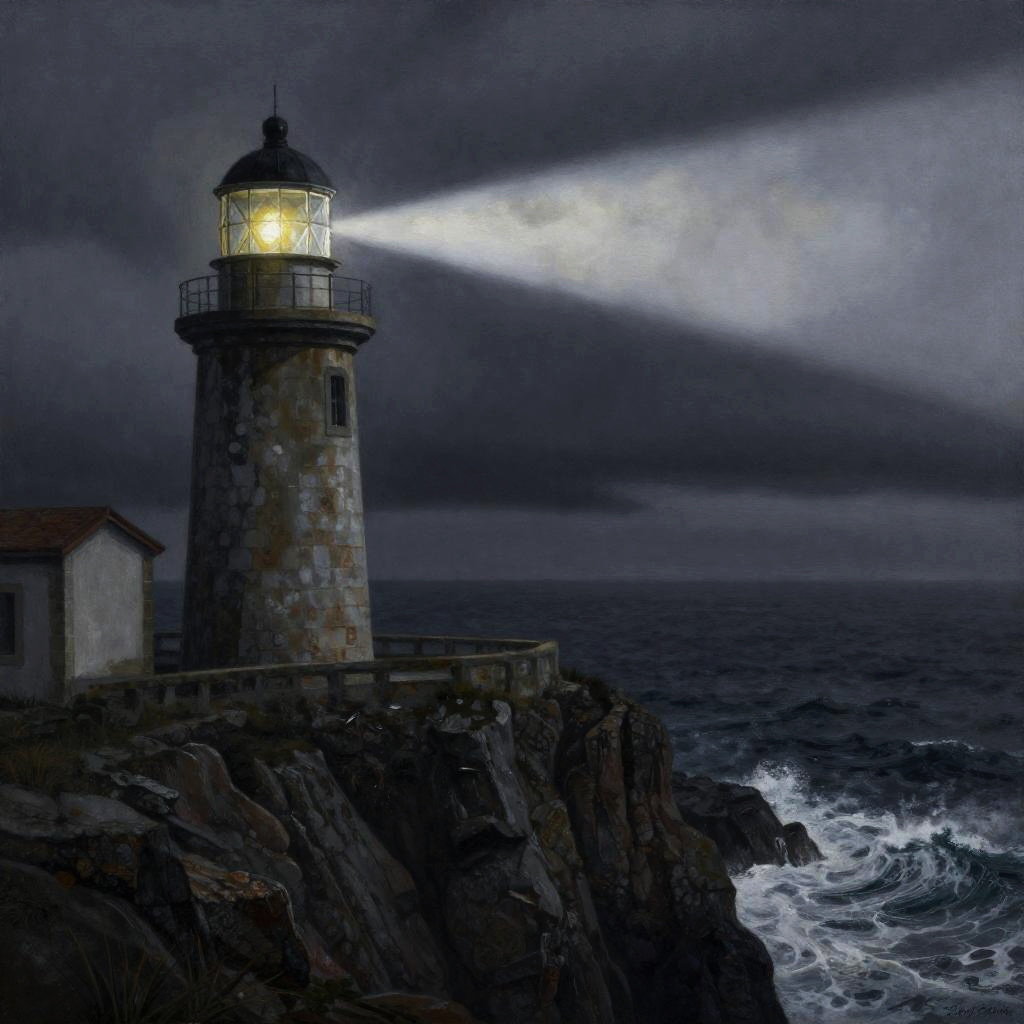 Charcoal painting by Emanuele Dascanio depicting a vigilant lighthouse keeper scanning the horizon, with weather-beaten stone textures, glowing beam of light cutting through mist, in a rugged coastal cliff with turbulent sea below, created with dramatic chiaroscuro with crisp photorealistic detail