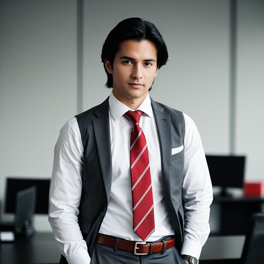 Man with dark brown hair, wearing a black suit and white shirt, leaning on the hood of a dark car. Hands on a piece of paper. Green field and distant buildings in the background. Clear sky. Daytime. Standing, slightly angled towards the camera.