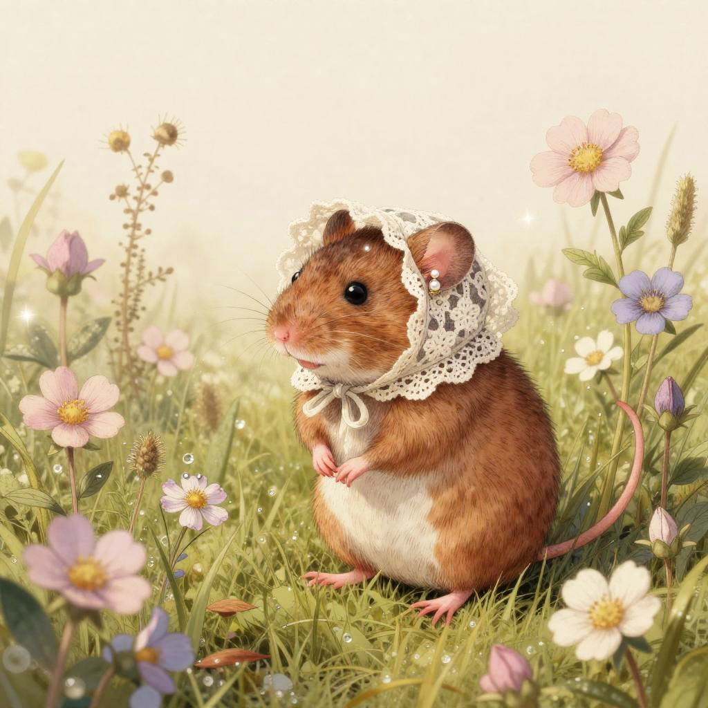 A timid wood mouse wearing a delicate lace bonnet with tiny pearl pins, set in a dewy meadow at dawn filled with pastel wildflowers, vintage illustration aesthetic with delicate linework and fine crosshatching, muted warm palette on a soft cream backdrop, ornate botanical detailing, gentle and charming atmosphere, soft rim lighting, subtle paper grain texture, balanced and symmetrical composition, slight vignette, natural bokeh sparkle, ultra clean edges, high fidelity details