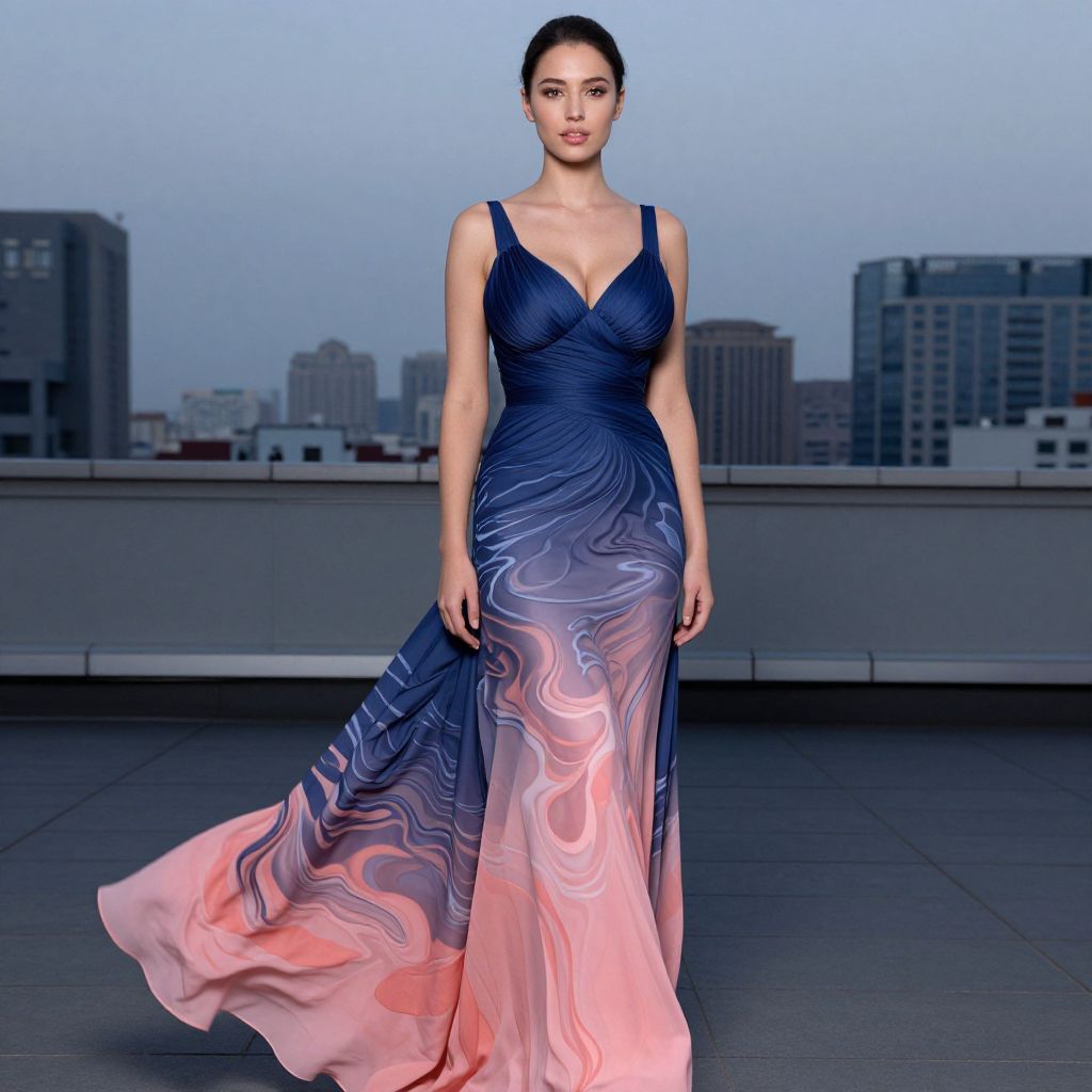 A sophisticated woman with fair skin, high cheekbones, and hazel eyes models a gradient dyed gown in a chic rooftop setting at dusk; the gown features a seamless fade from navy blue to coral pink, with artistic fabric patterns that mimic water ripples, creating a dynamic visual flow across the silhouette and draping gracefully against the city skyline.. The woman has big tits and cute face