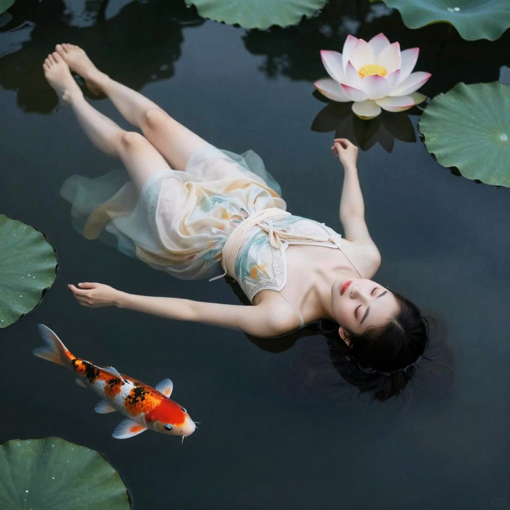(masterpiece:1.3), (best quality:1.2), 8k, absurdres, (extremely detailed:1.2), highestres, photo, realistic, solo, (1girl:1.2), floating, water, afloat, (lotus:1.2), (reflection:1.1), lying, (koi fish:1.1), from above