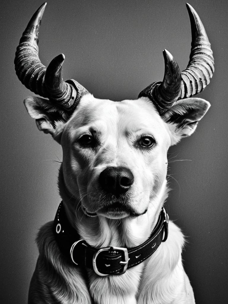 Portrait of a white dog with digitally enhanced red eyes and small horn-like attachments on its head. The dog wears a dark leather collar with a round, ornate gold pendant, set against a plain brown background. The image is a realistic, focused close-up of the dog's face and upper chest.