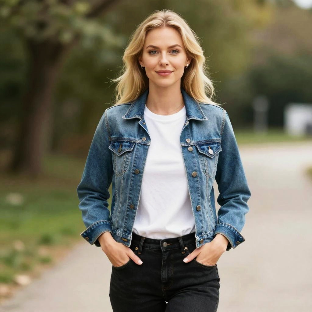 Photograph of a blonde woman standing outdoors in a sunlit alley. She has light skin and wears a light blue, button-up denim shirt with the sleeves rolled up, paired with black pants. Her hands are casually in her pockets. The background features a blue building with sunlight streaming through a window, casting shadows. Her expression is calm and slightly dreamy.