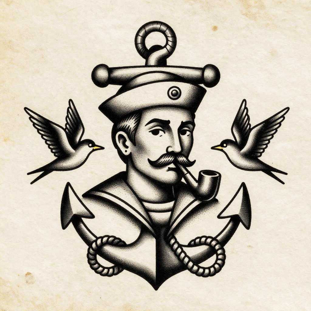 Monochrome ink illustration in a vintage tattoo flash aesthetic featuring male sailor with a handlebar mustache and a pipe, framed by anchor above, swallows on either side, and coiled rope below. Printed on tea-stained vellum, with crisp linework, stippling and crosshatching, bold negative space, subtle vignette, museum-print finish, high contrast, fine detail, gritty yet elegant mood.