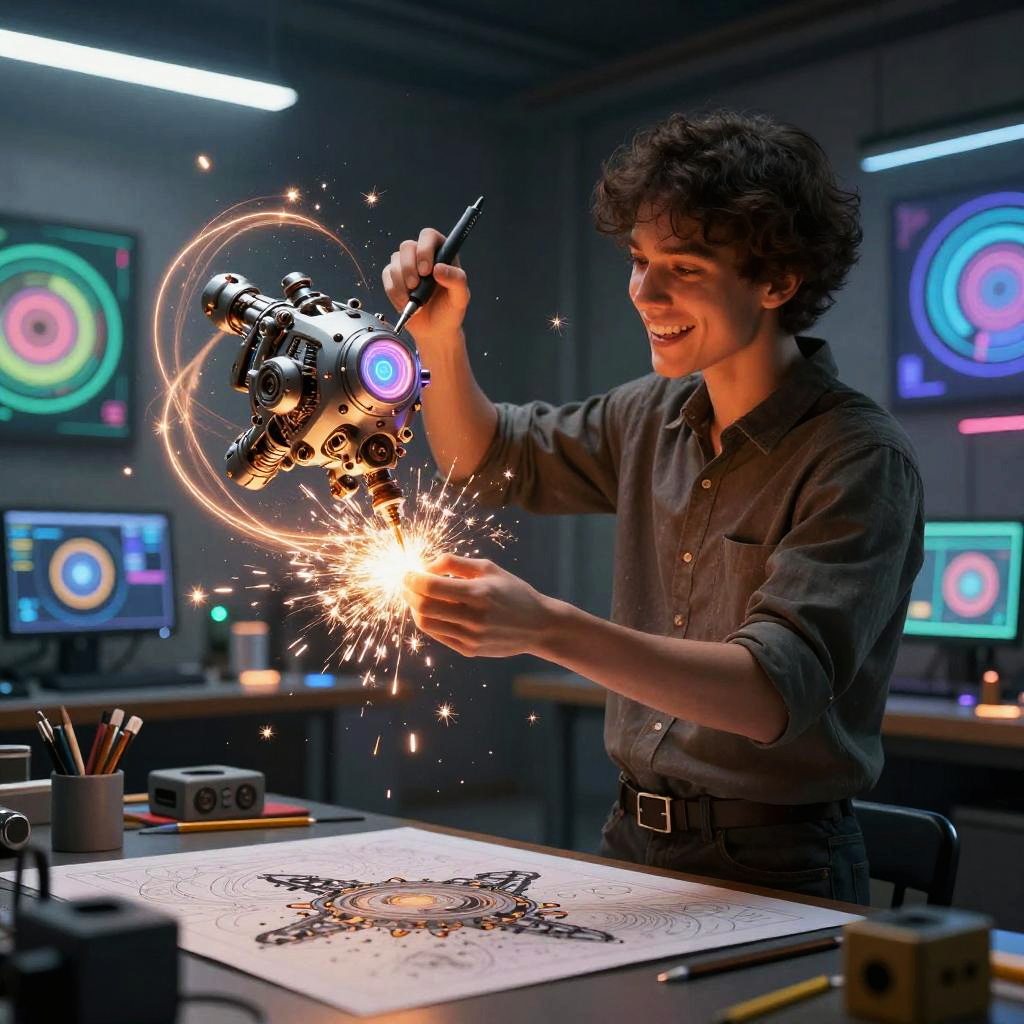 Dynamicrafter: an energetic artisan wielding glowing drafting tools creating intricate mechanical objects mid-air, surrounded by sparks and light trails, set in a high-tech workshop with futuristic gadgets, sharp and colorful digital art.