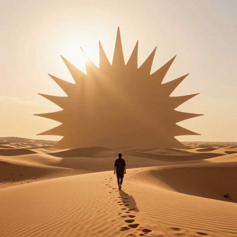 A surrealistic photograph of a colossal 10, 000-year clock rising from an endless desert, its intricate, metallic gears and ancient engravings gleaming under dramatic, low-angled sunlight, Stark contrasts of golden light and deep shadows highlight the clock’s divine presence, while shimmering sand particles add movement to the stillness, Towering dunes frame the scene, their sharp shadows emphasizing the desolation, The atmosphere is dreamlike and contemplative, blending the mechanical with the organic to evoke timelessness and humanity’s fragile relationship with eternity
