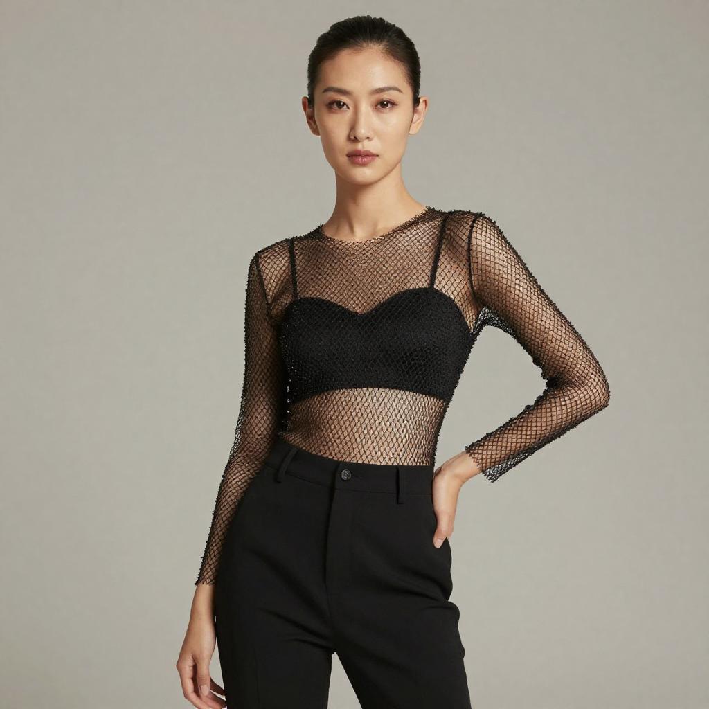 A woman poses confidently in a stylish, black netted top that highlights an artistic and modern fashion style. The sophisticated outfit, set against a neutral background, emphasizes her poised and elegant demeanor.