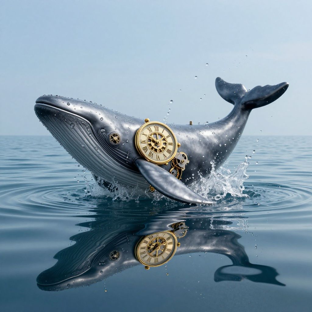 Clockwork whale emerges from the tranquil sea, its metallic body adorned with a golden Roman numeral clock face, splashing water droplets that ripple across the mirror-like surface below, reflecting a surreal blend of mechanical wonder and natural serenity.