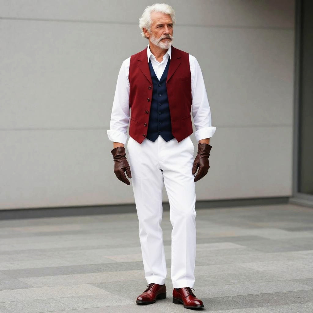A distinguished man with white hair and a beard is stylishly dressed in a red vest over a white shirt and navy waistcoat, paired with white trousers and brown leather gloves. The outfit is complemented by polished red leather shoes, creating a sophisticated and vintage-inspired look against a minimalist urban backdrop.