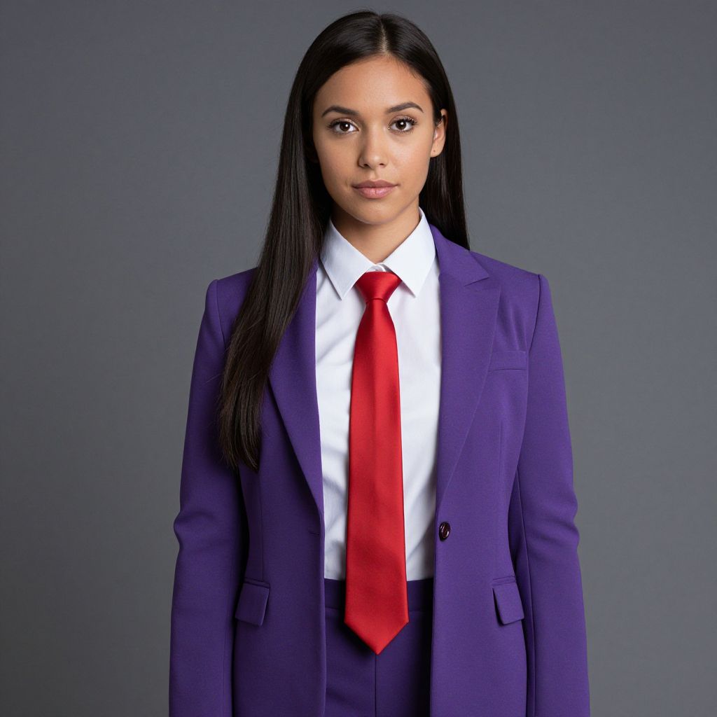 Photograph of a young woman with long, straight black hair, light brown skin, and brown eyes. She is wearing a purple business suit with a white dress shirt and a bright red tie. The background is a plain, dark gray gradient. She stands facing the camera with a neutral expression, her hands resting at her sides. The lighting is even, highlighting the colors of her attire and her smooth, clear skin. The overall style is professional and formal.