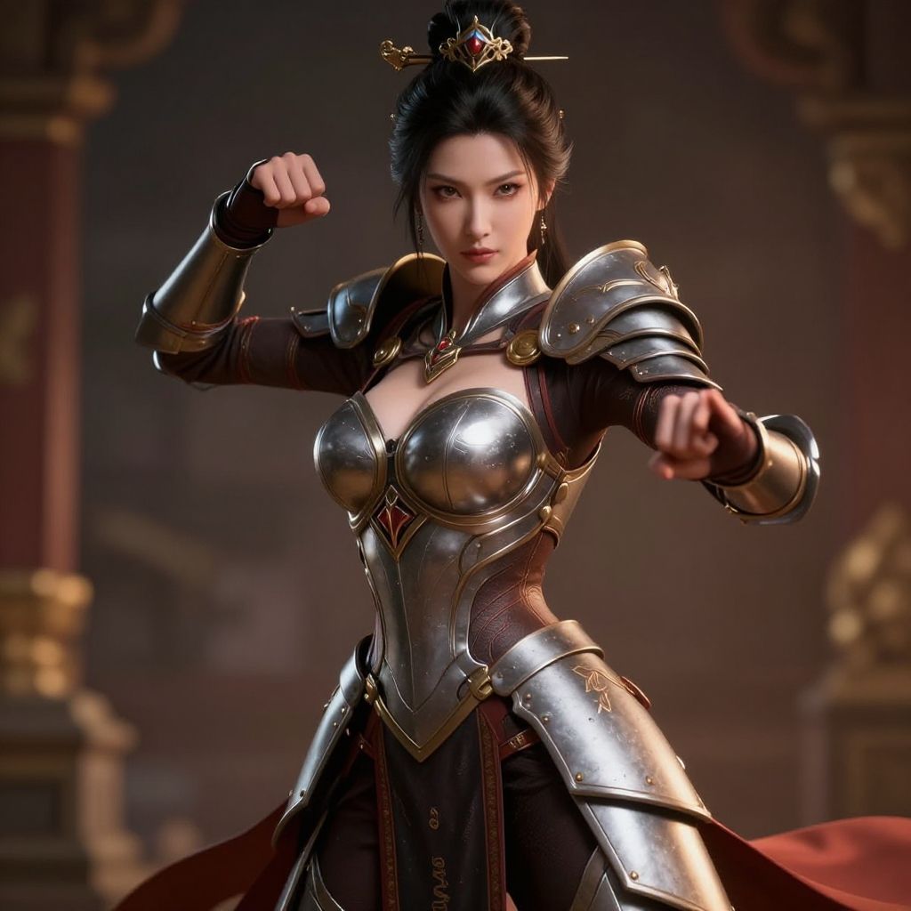 Digital art of an Asian woman in shiny, medieval-style armor with a revealing chest plate, posing confidently with fists raised. Dark, ornate background.