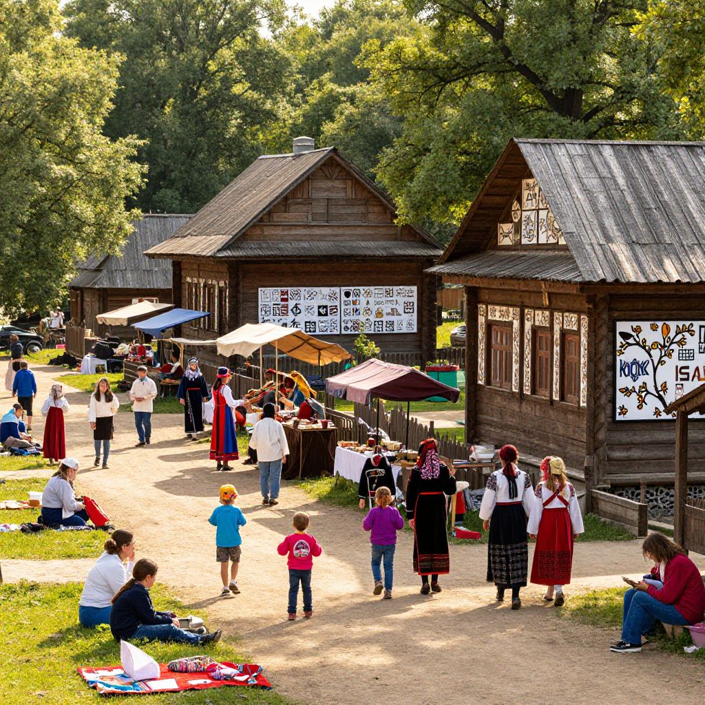 Kozak village scene with wooden huts and villagers in traditional clothing, market day with vibrant colors, bustling atmosphere, children playing, sunlight filtering through trees, folk art style with realistic details, warm and inviting mood.