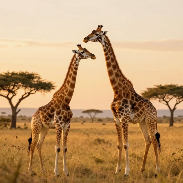 Short neck giraffes standing in a vibrant savannah at sunset, whimsical style, detailed patterns on their coats, warm golden lighting, playful and surreal atmosphere