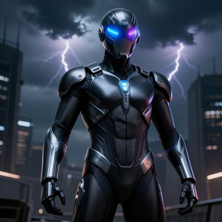 CGI image of a futuristic, armored superhero with glowing blue and purple eyes, standing in a stormy cityscape with lightning. Dark, metallic suit