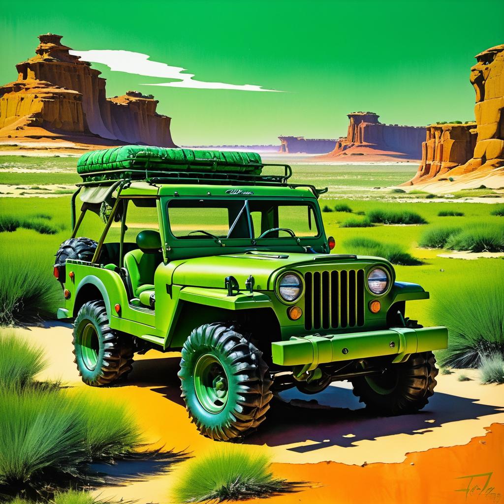 Powerful black SUV parked in a colorful desert setting featuring rocky formations and sparse desert vegetation. The vehicle has a classic design with large wheels, roof rack, and glowing headlights. The background showcases a surreal, vibrant color palette blending orange sands with deep purples and reds on the rock formations under a clear blue sky.