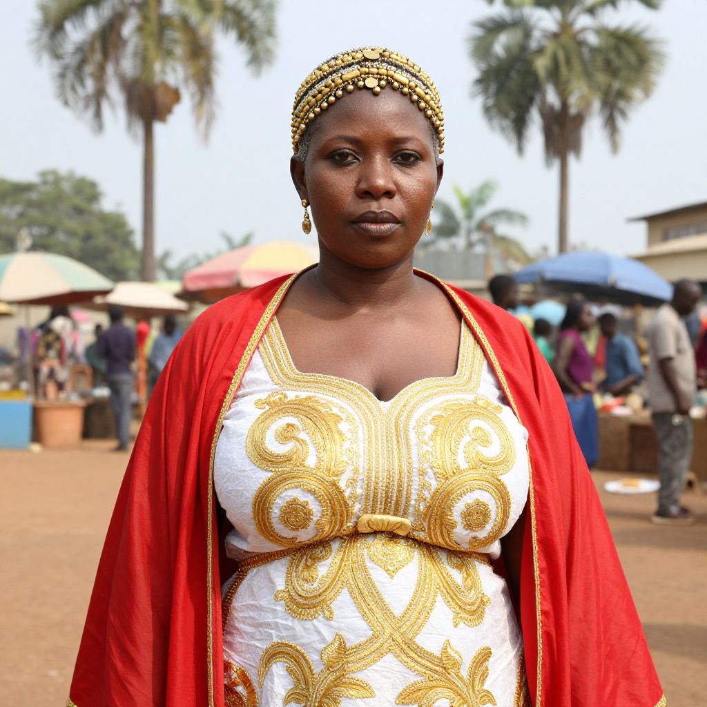 Photograph of a dark-skinned African woman with gold headpiece, wearing a white and gold embroidered dress with red shawl, standing in a bustling