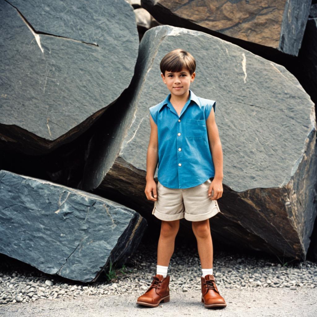 Full-body portrait of a young boy standing outdoors in a slate-themed Flintstones costume. He wears a sleeveless blue collared shirt, beige shorts, white socks, and brown ankle boots. The background features large dark grey slate rocks, adding a natural rugged setting.