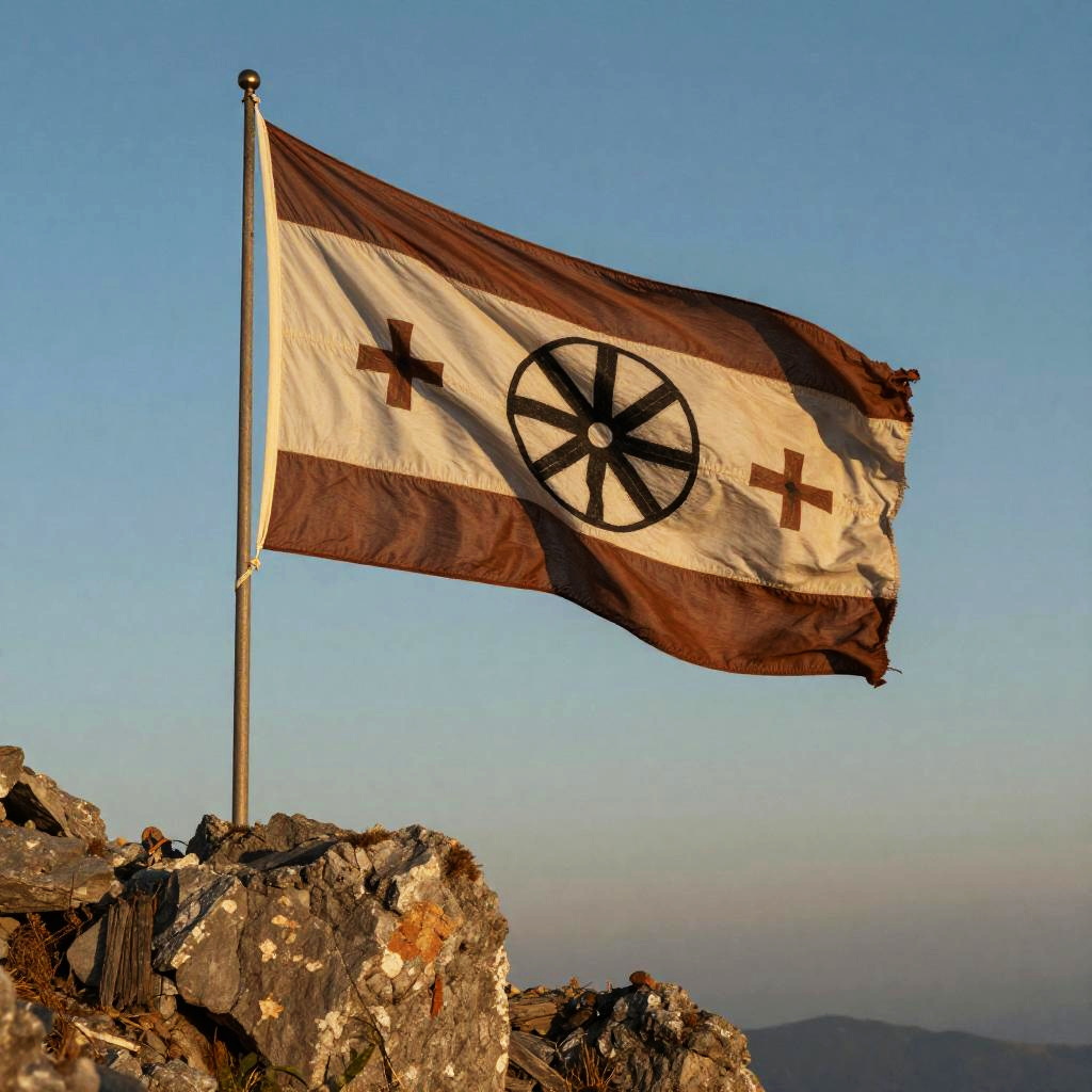 Anarcho primitivism flag waving boldly against a stormy sky, earth tones with tribal patterns, rough fabric texture, symbolizing return to nature and anti-industrialism.