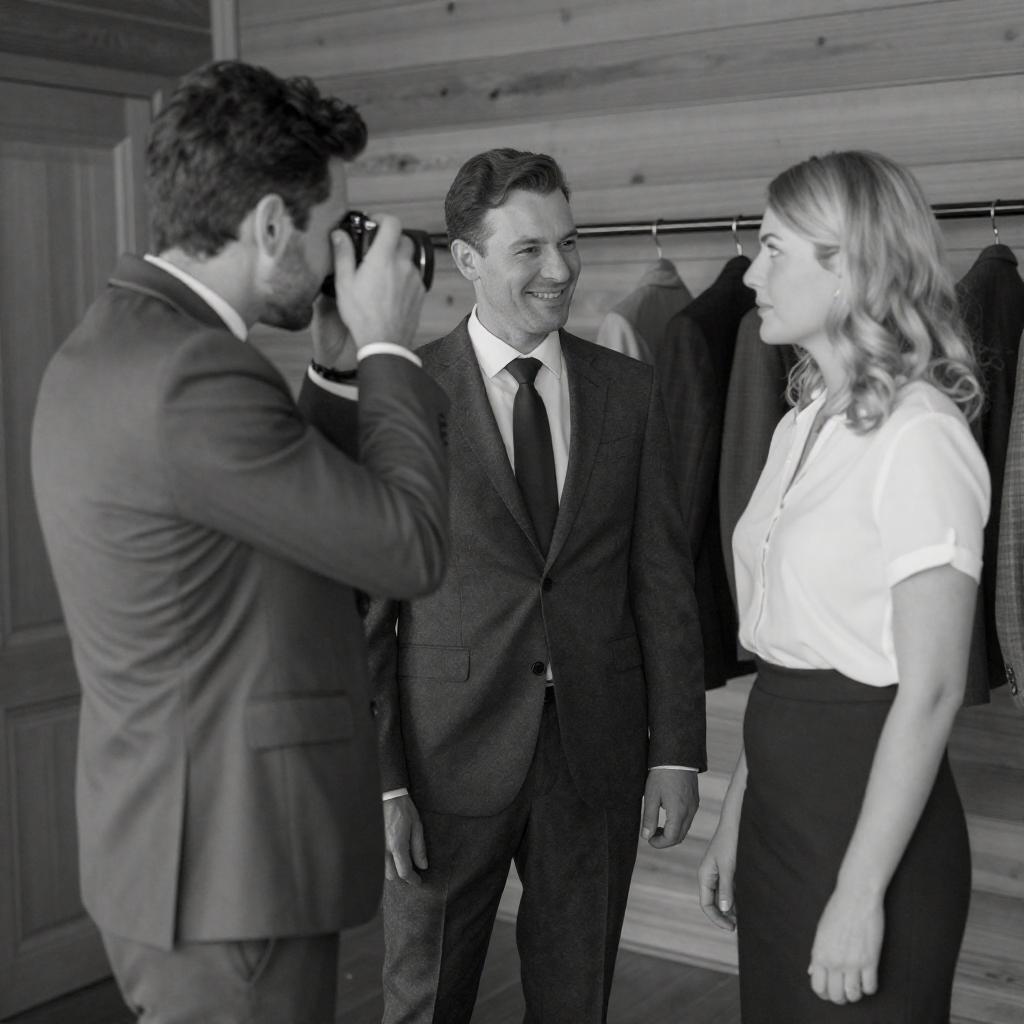 Black and white photograph of three people in a wooden room. Two men in suits stand facing a blonde woman in a blouse and skirt. The man on the left holds a camera to his eye, the man in the center smiles at the woman, who looks back at him. Clothes hang on a rack in the background.