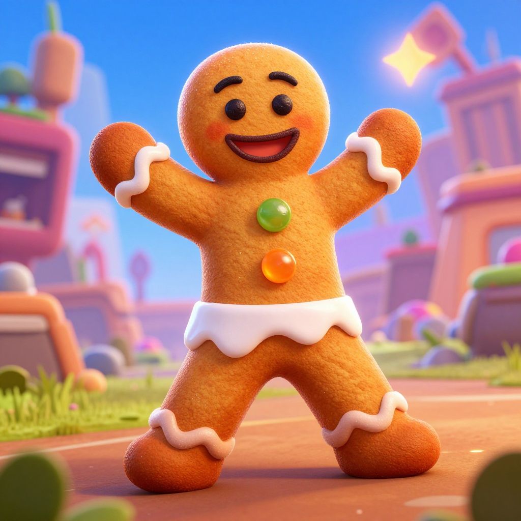 CGI image of a cheerful, orange gingerbread man with white icing accents, green and orange buttons, standing in a colorful, sunny outdoor scene with