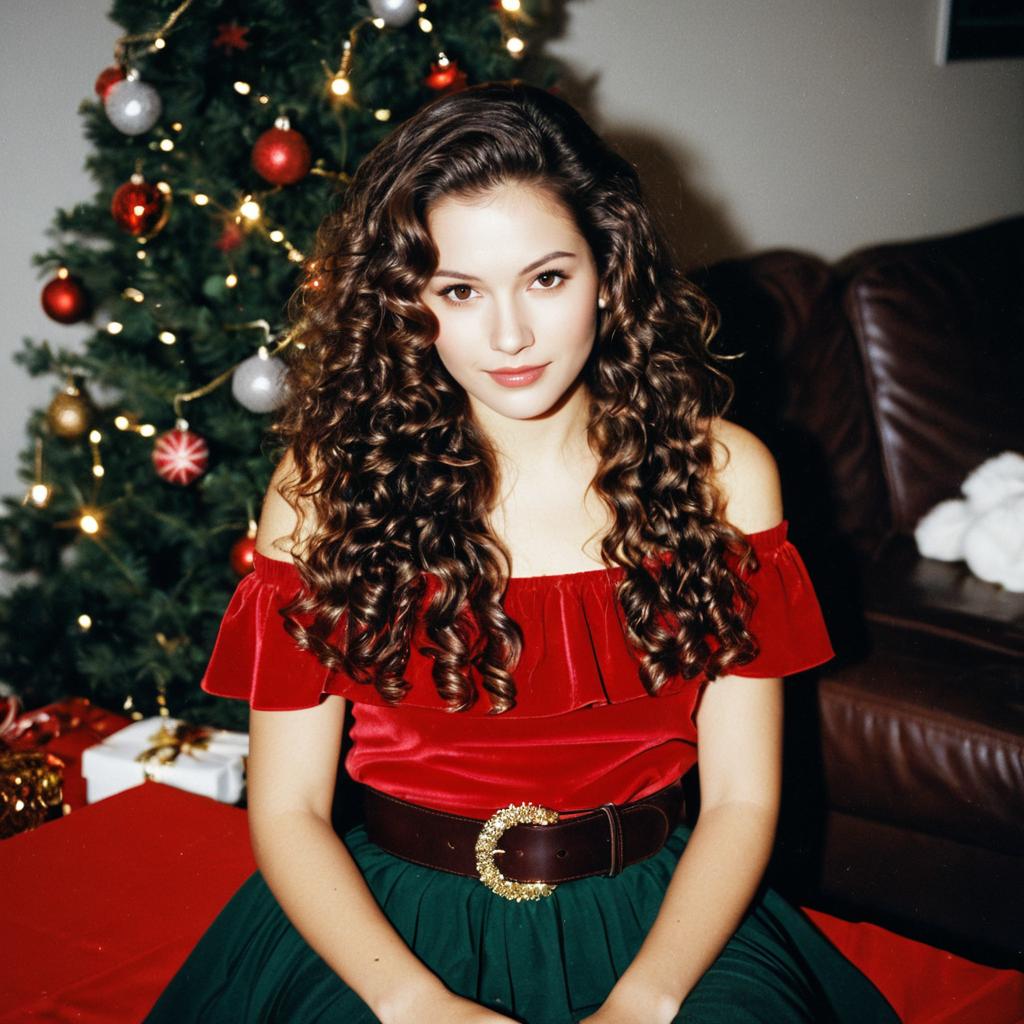 Night before christmas sally,1girl, christmas tree, solo, long hair, brown hair, dress, christmas, brown eyes, looking at viewer, christmas ornaments