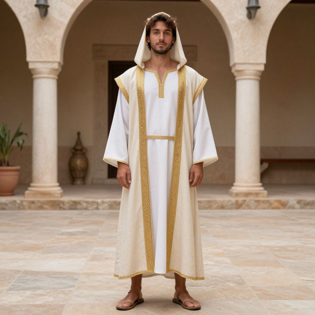 Nativity Outfit Costume, a man dressed in a robe and sandals standing in a courtyard