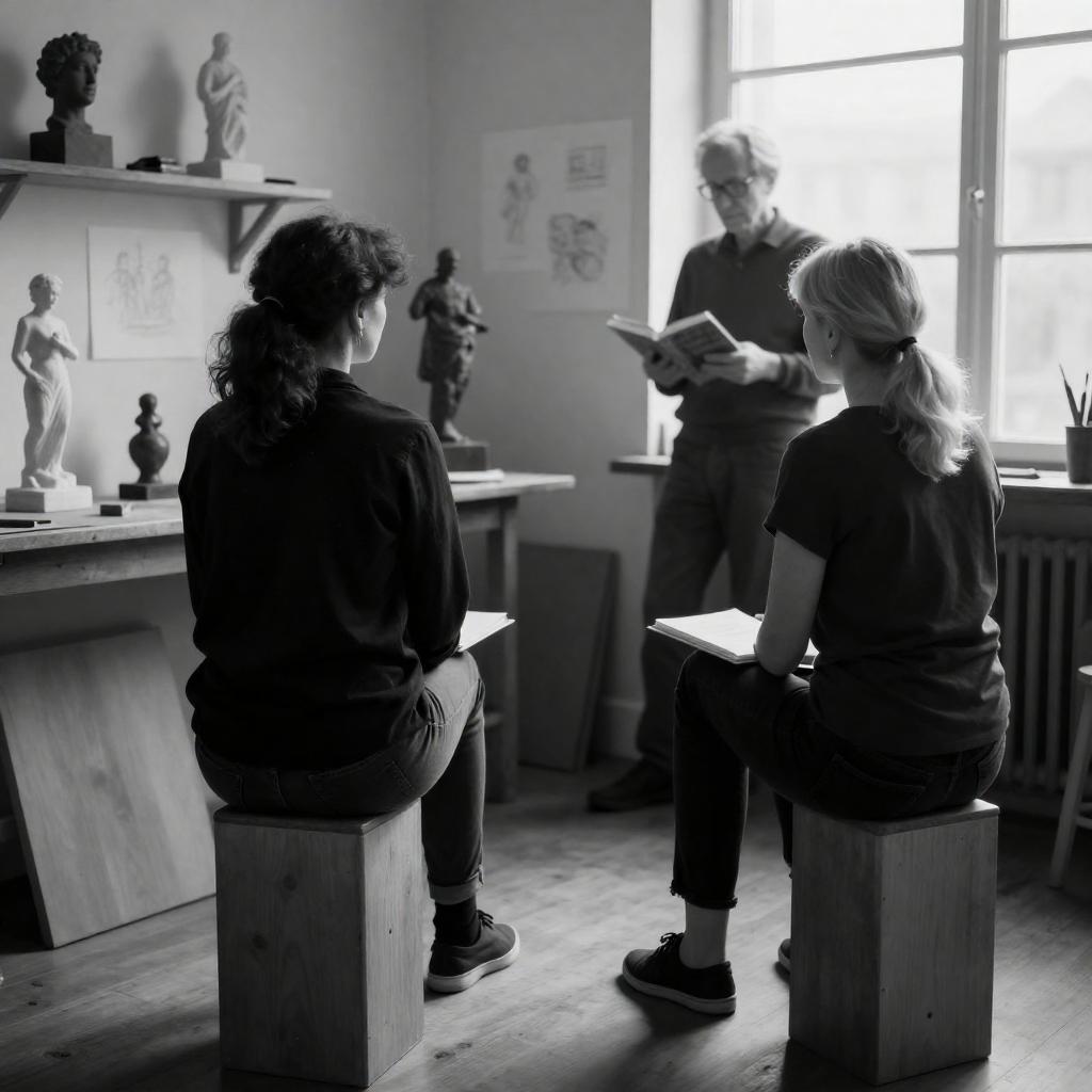 Black-and-white photograph of an artist's studio. Two nude women sit on wooden blocks, back to camera, one with dark hair, one blonde. Older man with glasses stands near a window, holding a book. Sculptures and sketches on walls. Bright light from window. Women's bodies in shadow, man's face lit.