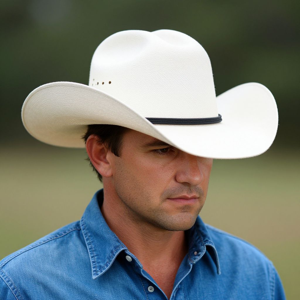 "White Cowboy Hat, man wearing a cowboy hat and a blue shirt"