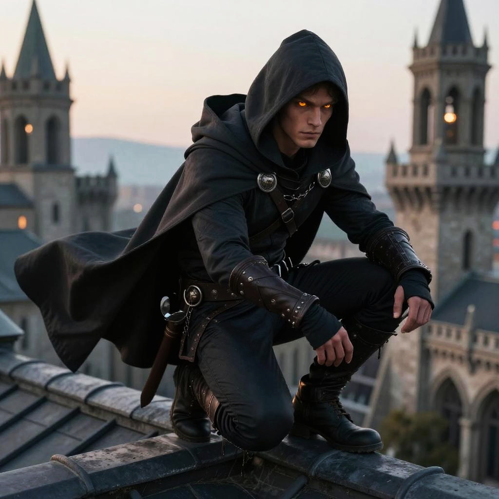 Handsome goblin rogue, sleek and agile, dark hooded cloak, piercing amber eyes, perched on a rooftop in a medieval city at dusk, atmospheric lighting, detailed character design
