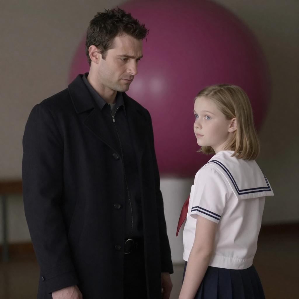 Photograph of three people in an elegant room. A bald man in black, a smiling young woman in a school uniform, and a red-haired woman in a patterned suit. The woman and man face each other, while the girl sits between them. Gold curtains, floral arrangements, and ornate furniture in the background.