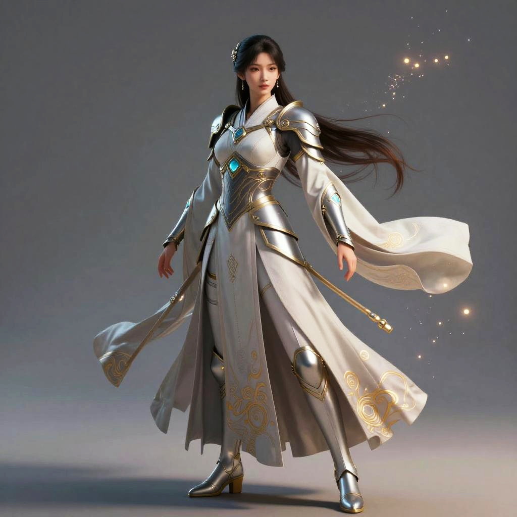 Stable diffusion pose prompts showcasing futuristic characters in flowing robes and armor, posed mid-motion with energy particles diffusing softly into the air, rendered in a semi-realistic style with dynamic shadows, cool and warm color contrasts.