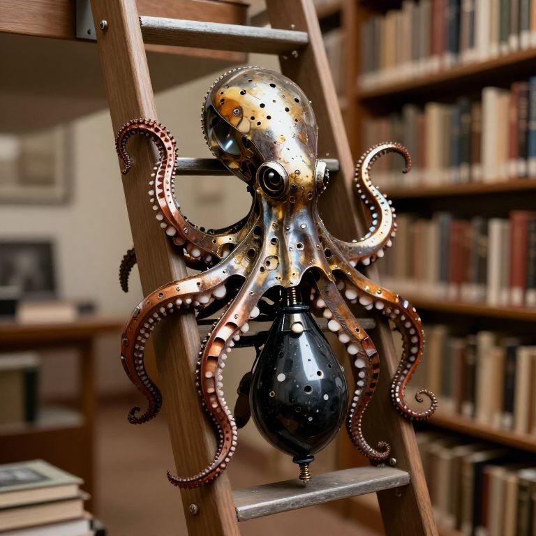 Photograph of a metallic octopus sculpture with a black teardrop-shaped body, golden and copper-colored head, and brown, curled tentacles adorned with small, white, bead-like protrusions. The sculpture is affixed to a wooden ladder in a dimly lit library, with bookshelves filled with variously colored books in the background. The octopus's reflective surface and intricate design stand out against the warm, wooden textures and soft, ambient lighting of the library.