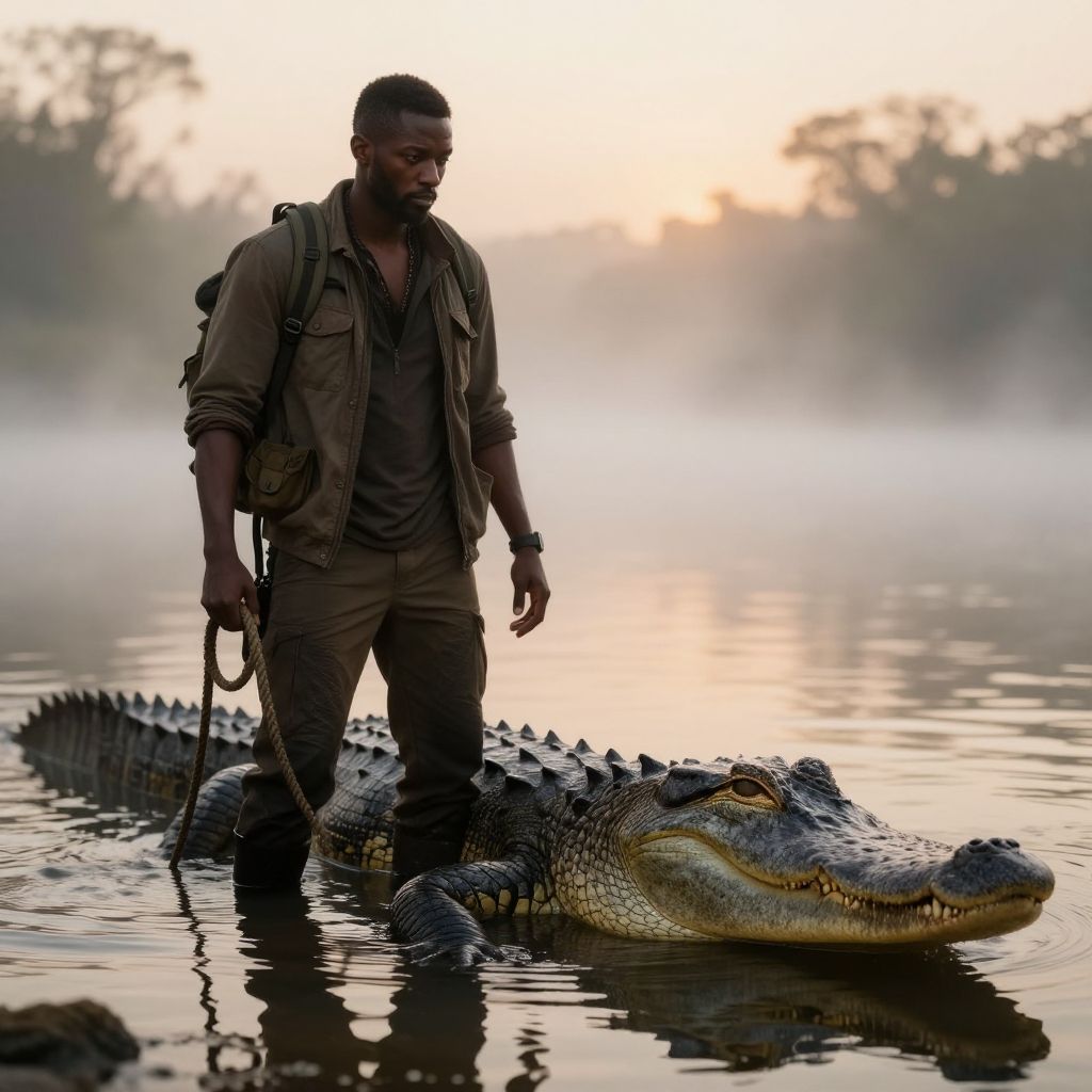 Black guy in rugged adventure outfit, holding a rope next to a fierce alligator in a misty river at dawn, dramatic lighting, realistic textures, intense and mysterious vibe