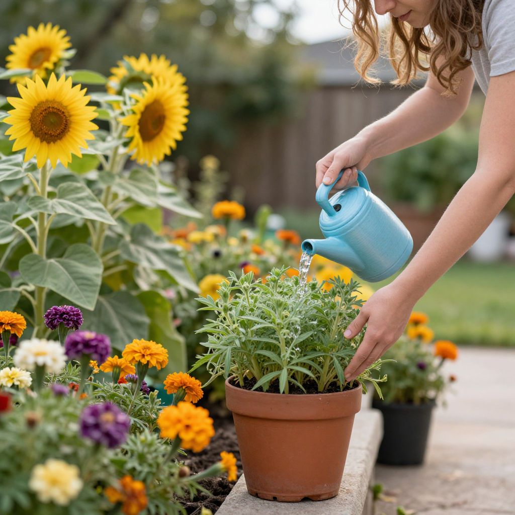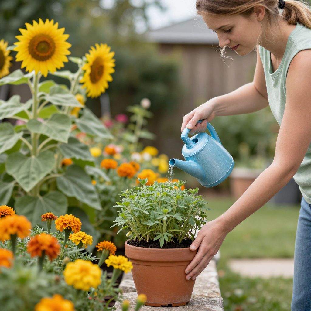 Woman tending to vibrant garden plants, watering a potted herb in a serene outdoor setting surrounded by colorful sunflowers and marigolds under soft sunlight.