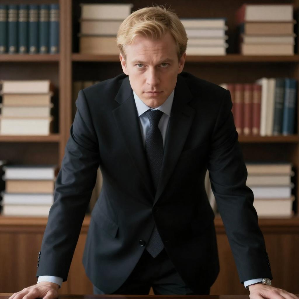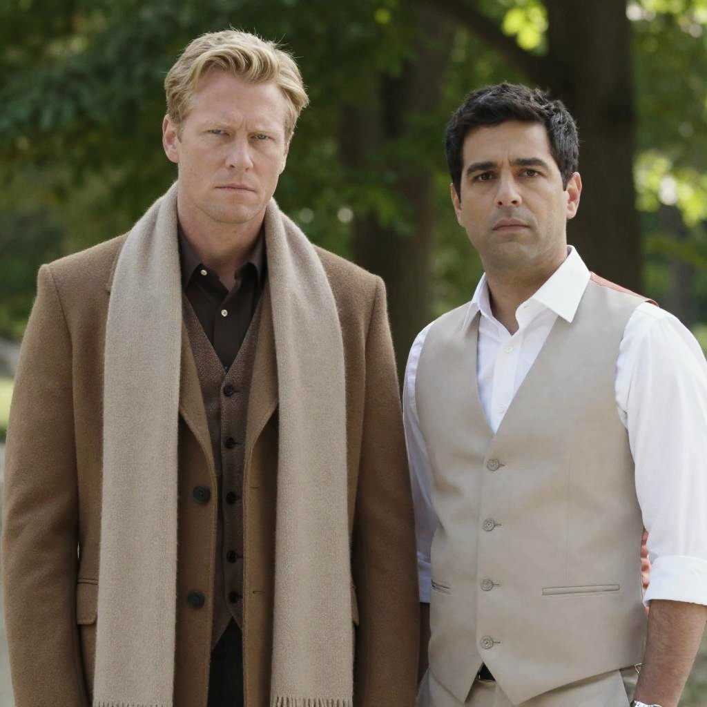 Photograph of two men in black tuxedos. The man on the left has brown hair, wears a black bow tie, and looks forward. The man on the right, with short blonde hair, points at a white music stand, wearing a red tie. Dark, blurred background. Both men wear serious expressions.