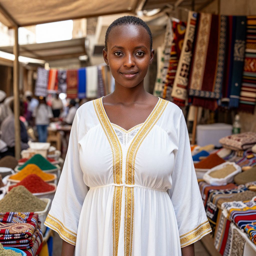 A realistic photograph of an Ethiopian Habesha woman with deep brown eyes, defined cheekbones, and a warm, serene smile, wearing a white floor-length dress with intricate gold trim along the hem and sleeves, standing in a traditional Ethiopian market in Addis Ababa, with vibrant colors, stalls selling spices and textiles in the background, soft natural light streaming through the open shade of an awning.. The woman has big tits and cute face