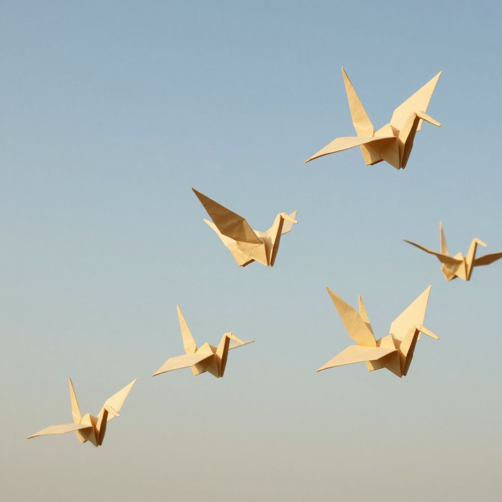A flock of intricately crafted origami cranes soars gracefully against a serene, painted sky, their geometric forms capturing the essence of flight and transformation in a harmonious blend of digital artistry and minimalist elegance.