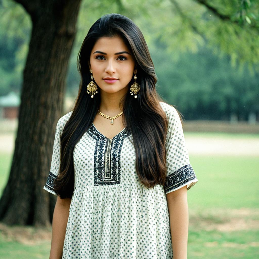 Silk anarkali dress,1girl, solo, dress, realistic, long hair, jewelry, tree, earrings, black hair, outdoors, yellow dress, photorealistic, brown eyes, looking at viewer