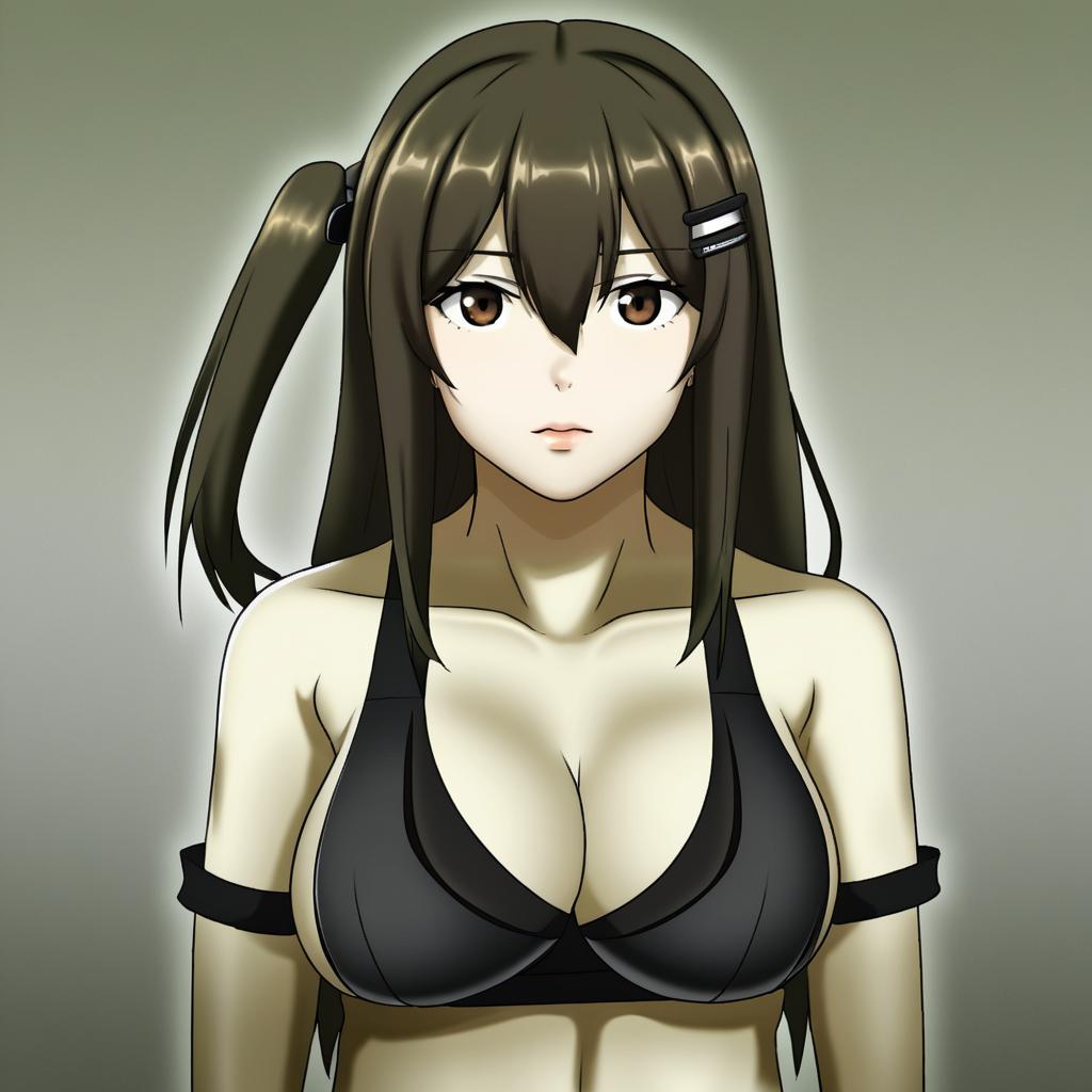 K2 (girls' frontline), girls' frontline, 1girl, brown eyes, hair between eyes, brown hair, long hair, sidelocks, hairclip, medium breasts, large breasts, cleavage, navel, collarbone, black panties, bare shoulders, one side up, by artist cheer (cheerpuppy14), anime
