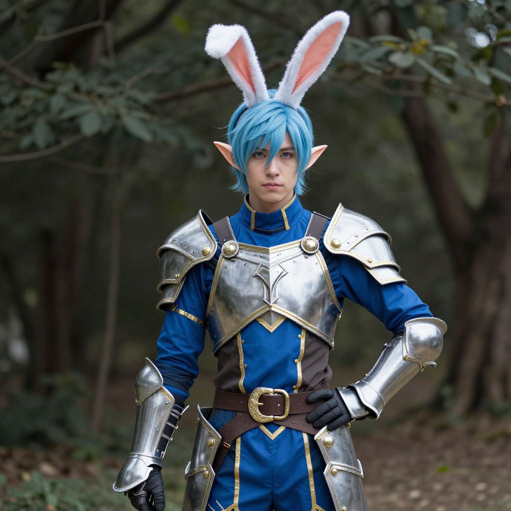 Photograph of a young man in blue cosplay armor with silver shoulder and arm guards, white bunny ears, blue hair, and elf ears, standing confidently