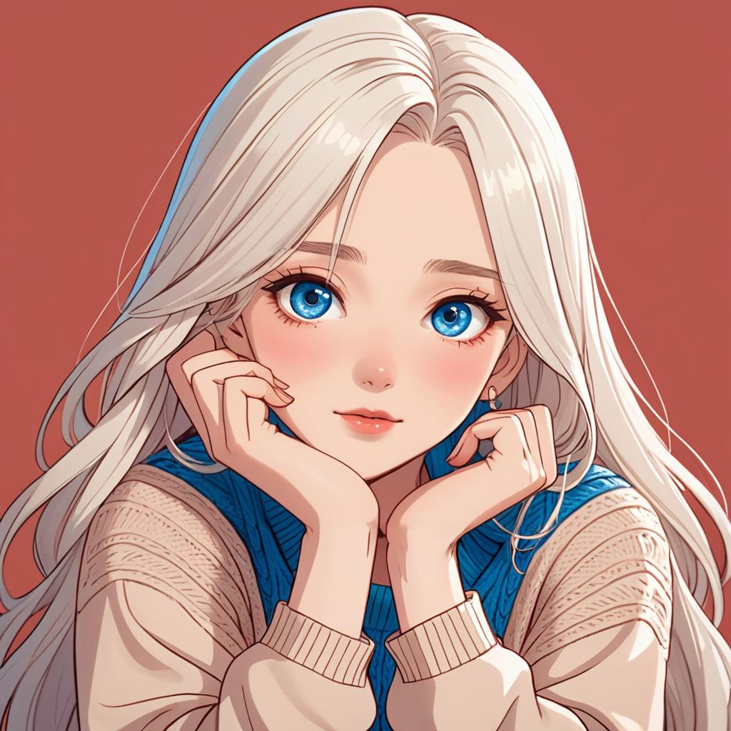 Portrait of a woman with long white hair and expressive blue eyes, soft shading and clean lineart, wearing a beige knitted sweater, sitting with her hand resting on her face against a muted red background, anime style