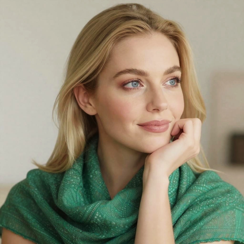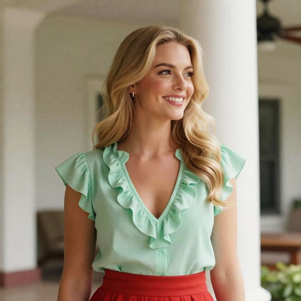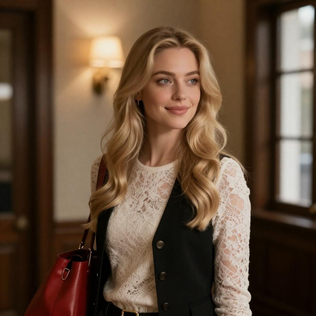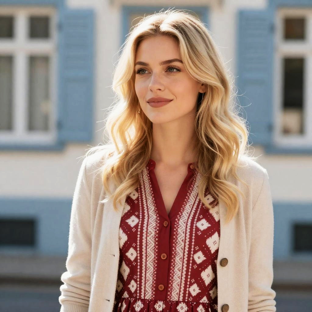 Photograph of a blonde woman with wavy hair, wearing a beige cardigan over a red and white patterned dress, standing outdoors. She has a slight smile and looks to the side. Background shows blurred blue and white building windows. Sunlight highlights her hair.