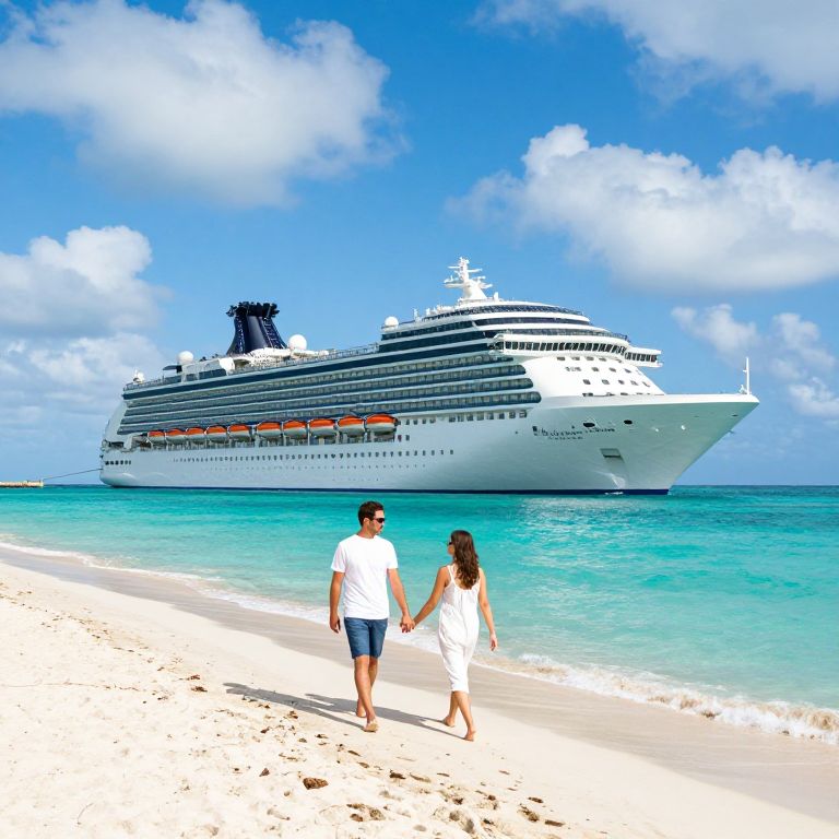 Cruising along the turquoise waters of Miami, Key West, and the Treasured Islands, a couple strolls hand-in-hand on a pristine sandy beach as a majestic cruise ship docks gracefully in the background under a vibrant blue sky dotted with fluffy clouds.